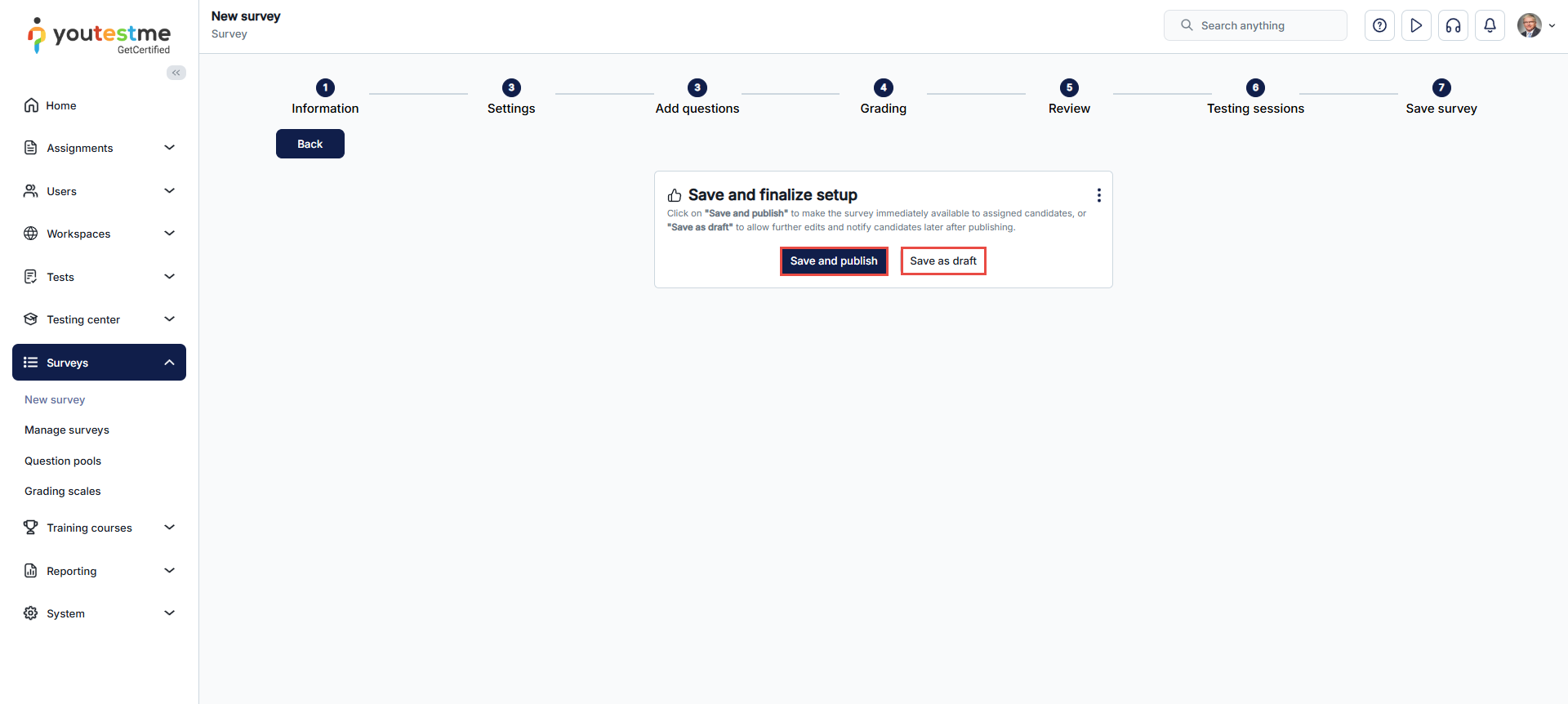This is the last step in the Survey creation wizard where you should click the Save and publish button to save and publish your survey. To make the survey available to candidates, you need to schedule testing sessions.