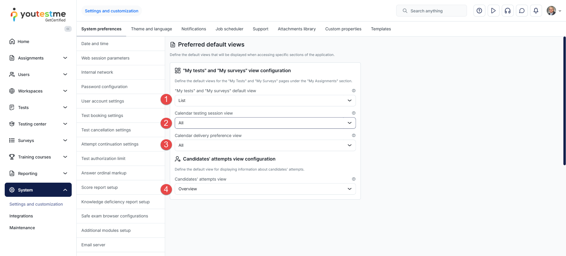 Access the page by navigating to the System section in the main menu and then selecting Settings and customization. Customize your testing experience by configuring parameters to adapt the application to your specific requirements.