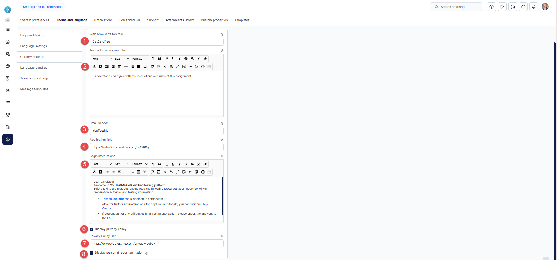 Options include setting up the mail server and notifications, specifying language preferences, branding the application, and more. For detailed information on each setting, refer to the content below.
